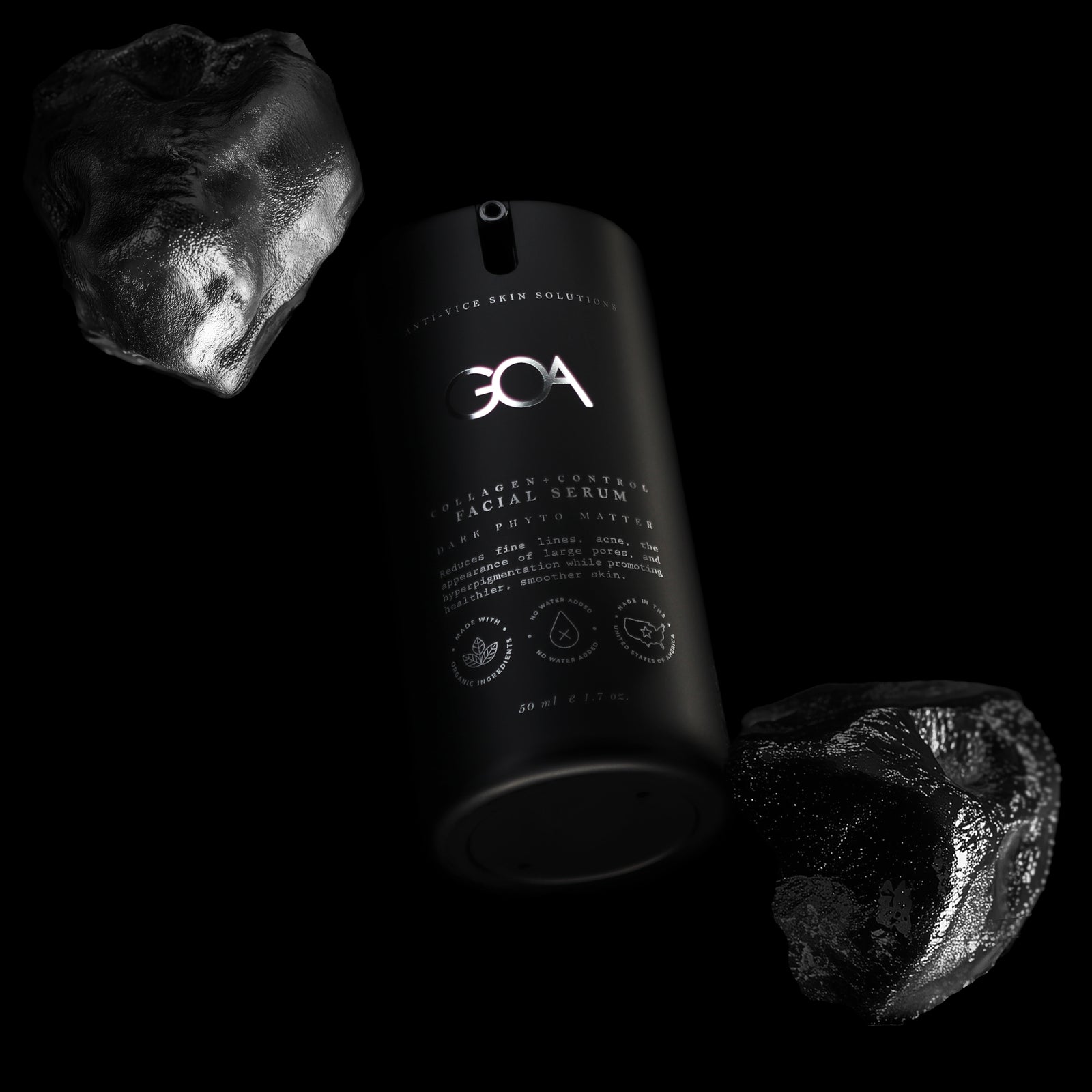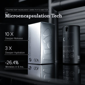 GOA's Serum is made with Dark Phyto Matter, combining microencapsulated retinol, stabilized Vitamin C, Niacinamide, MSM, Salicylic Acid for deep repair, brightening, and enhanced skin texture and clarity.