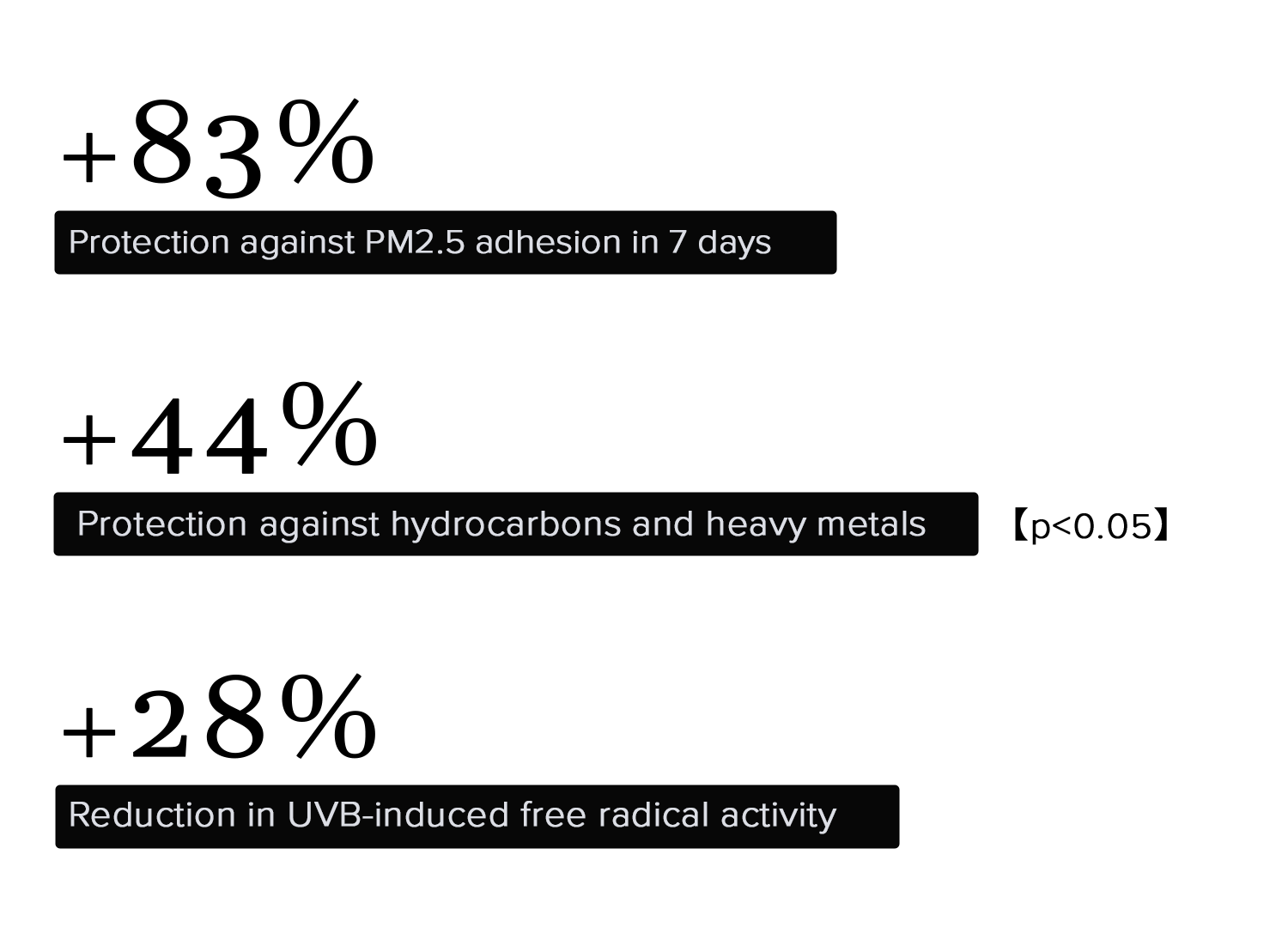 A bioactive film forms an invisible shield on the skin, blocking pollution, preventing particle buildup, and supporting a clearer, healthier-looking complexion with daily use.